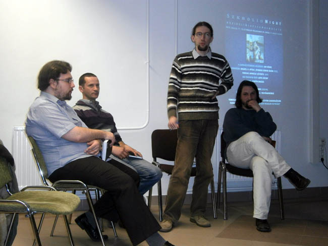 Áfra János, Balajthy Ágnes, Bényei Péter, Gesztelyi Hermina, Jován Katalin (Szkholion szerkesztőség tagjai); Uri Dénes (moderátor)