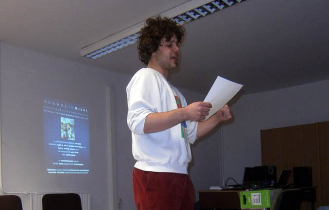 Az est a beszélgetés után Asbóth Balázs (Asy) slam poetry előadásával folytatódott. A fiatal slammer egy játékos salesman-jelenettel nyitott, hiszen kiderült, a rendezvényre éppen egy árusítói továbbképzésről szökött el, közönsége nagy örömére. Így megismerkedhettünk a Panda bandával, a Huligán Bodobáccsal és a lapszám tartalma is slam formában elevenedett meg.