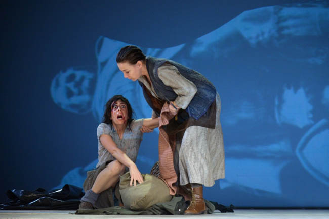 Az előadás másik meghatározó szereplője a néma Kattrint alakító Pálos Hanna, akinek igazán jól áll, ha nem beszél. Míg a