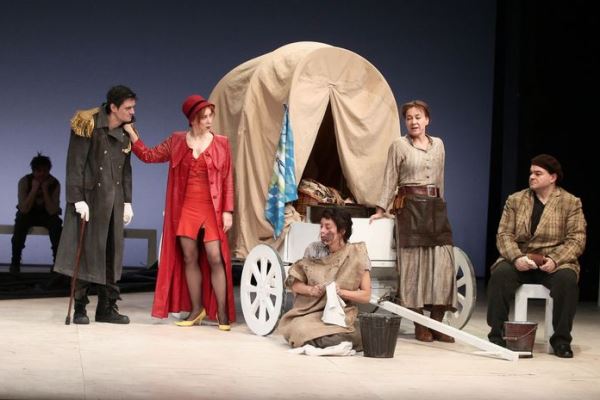 Kurázsi mamát, illetve az, hogy a nézőtéren két középiskolai osztály is bent ül.