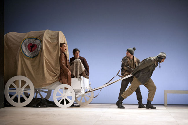 babakocsira hasonlít: fehérsége töretlen a mocskos háborúban eltöltött évek ellenére is; olykor a színpadon felbukkan kicsinyített, „játék” változata; ráadásul a gyerekbolond Kattrin időzik benne a leggyakrabban, akinek a béke a családalapítást jelentené, és akit halálakor anyja a szekér ponyvájával terít le. De találó a kukazsákra hasonlító ponyvák használata is sátor, illetve háztető gyanánt, mely remekül érzékelteti, hogy a háborúban az otthonunkból is bármikor szemétdomb válhat.